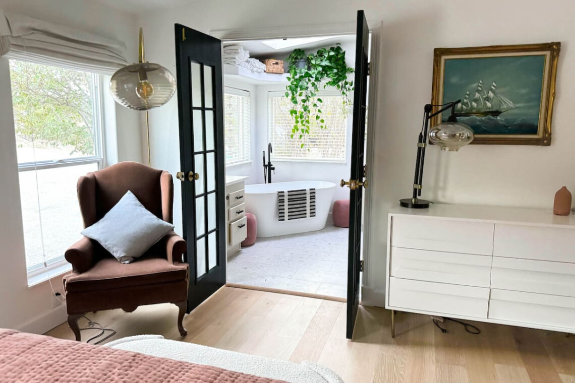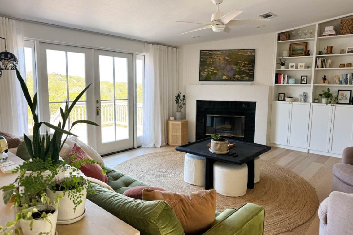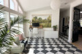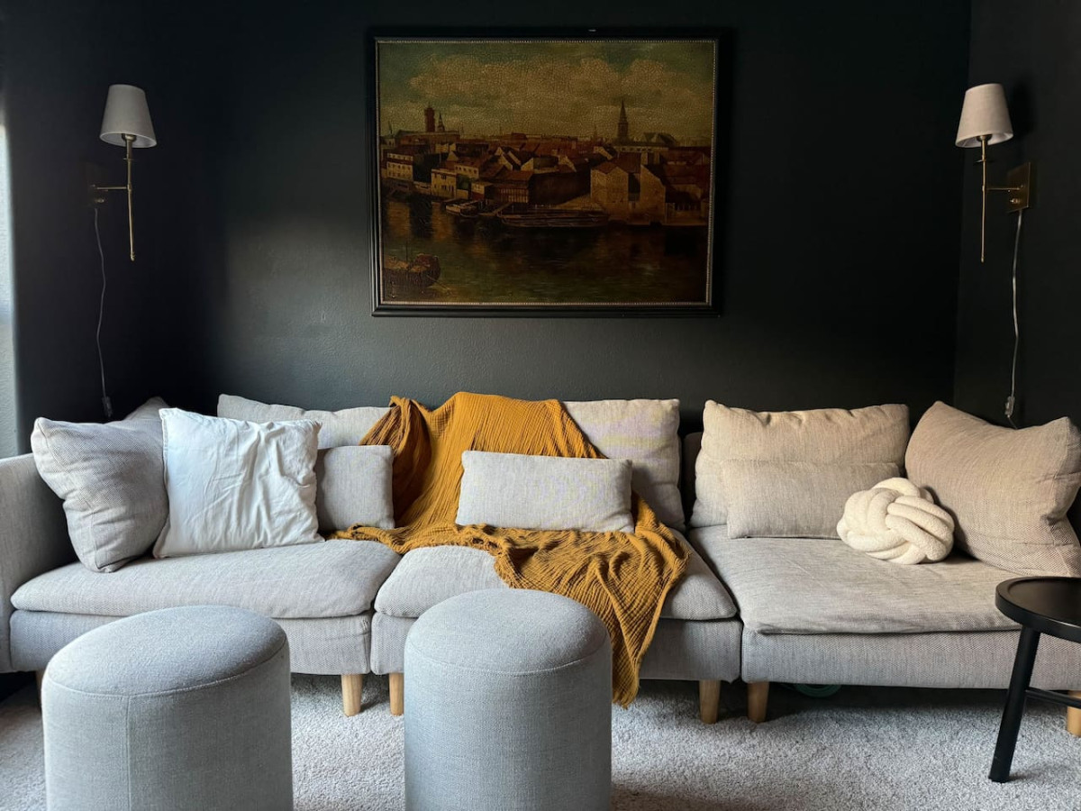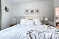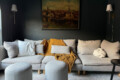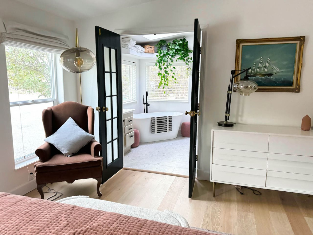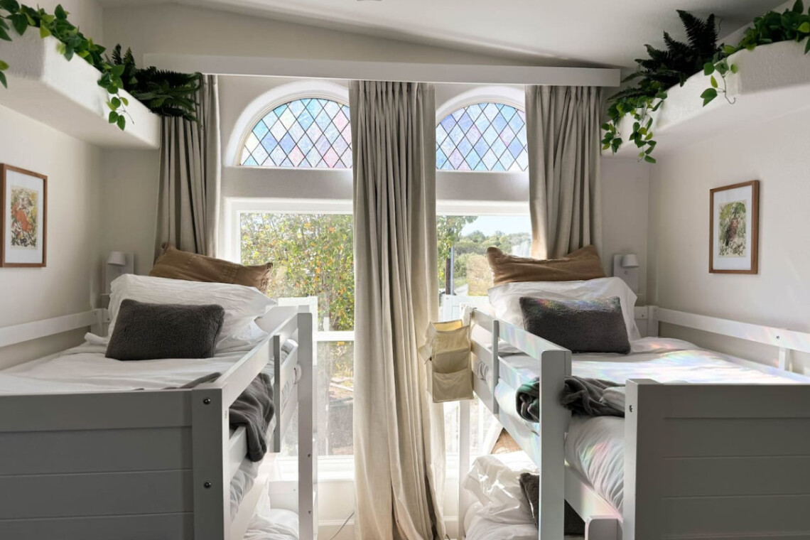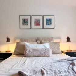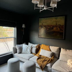 The main living room is decorated with quirky art from around the world, a lush velvet couch and armchairs, and a Smart Samsung frame TV with Sonos sound system. Enjoy the cozy ambiance created by the wood fireplace as you nestle in for ultimate comfort.