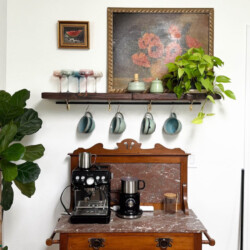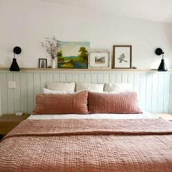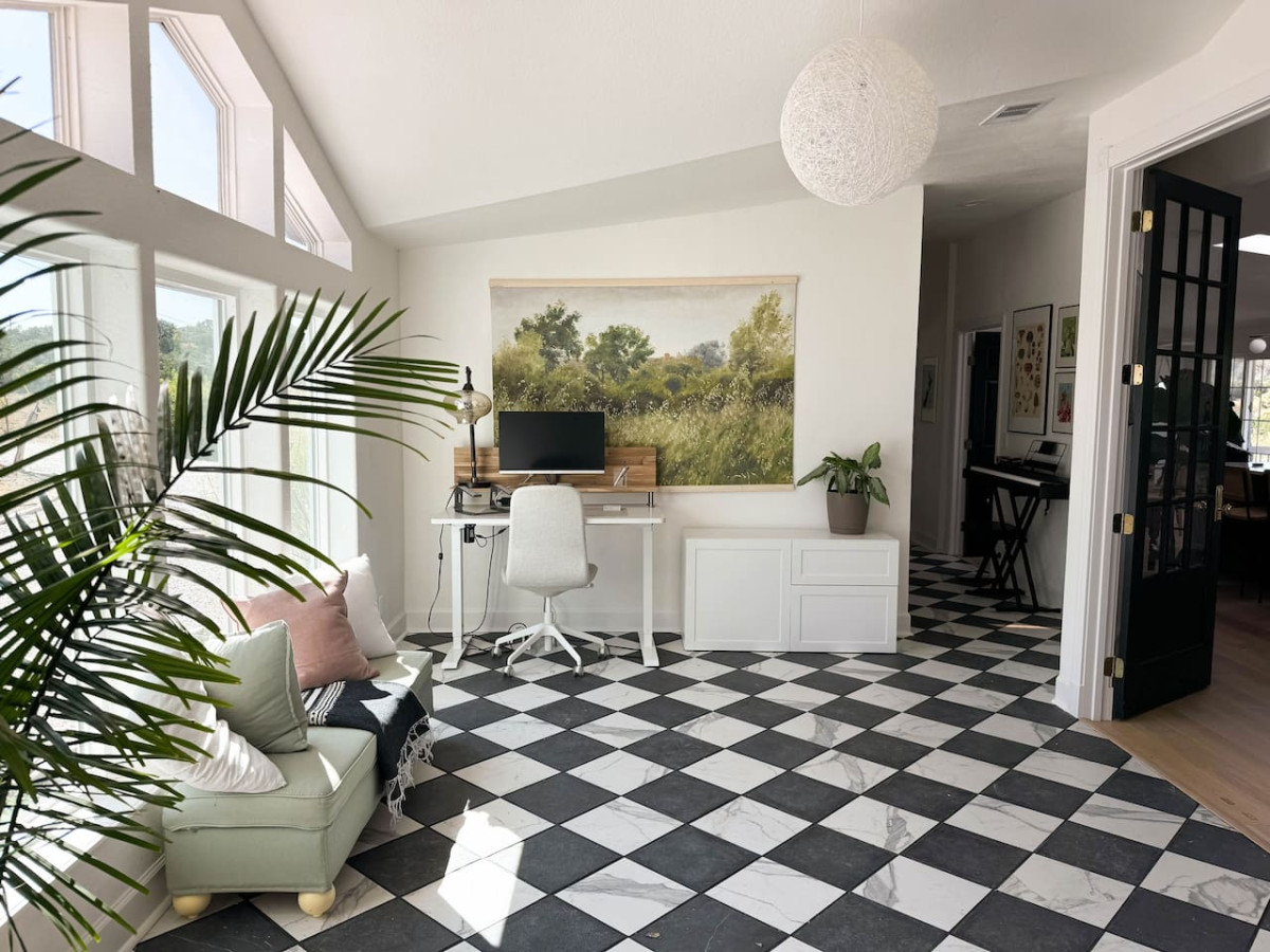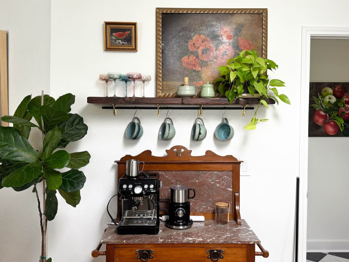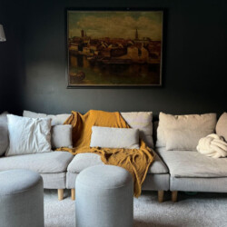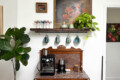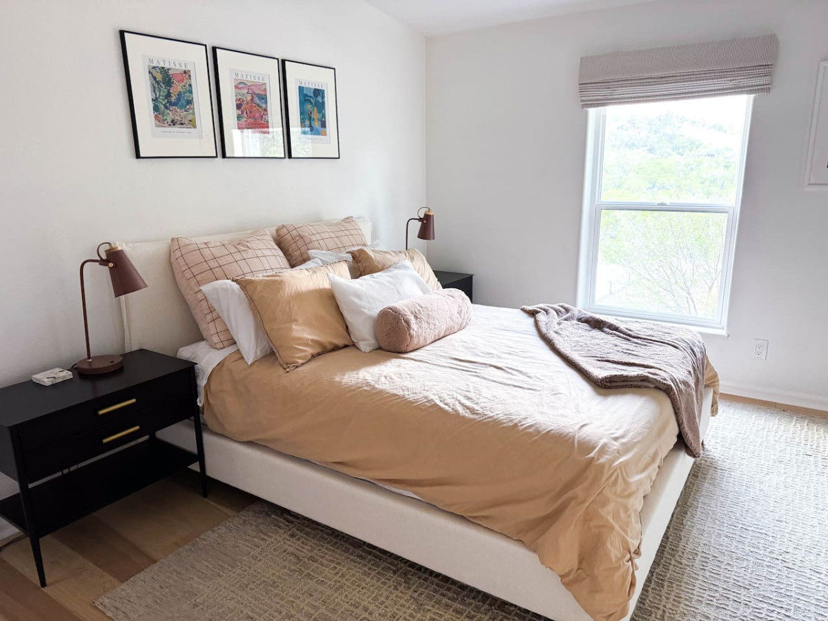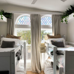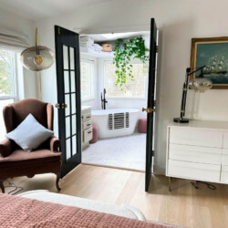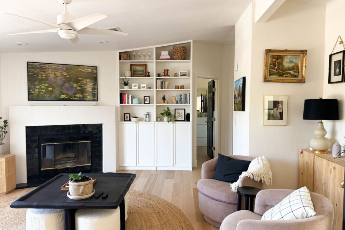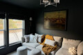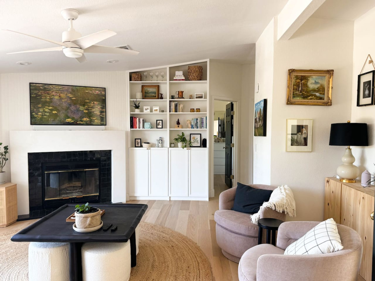 The main living room is decorated with quirky art from around the world, a lush velvet couch and armchairs, and a Smart Samsung frame TV with Sonos sound system. Enjoy the cozy ambiance created by the wood fireplace as you nestle in for ultimate comfort.