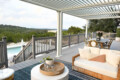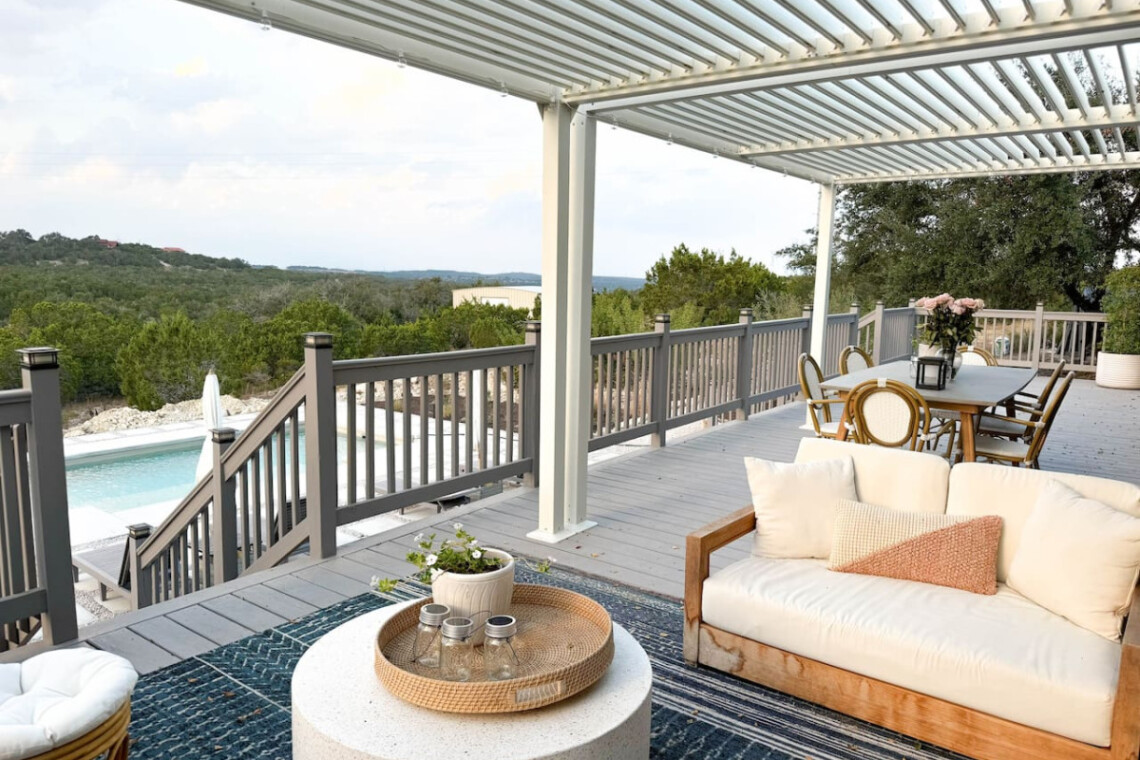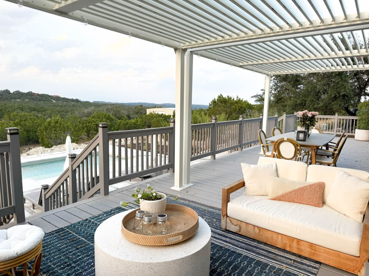 The french doors in the living room open up to a huge 50-foot back deck with louvered pergolas covering the outdoor seating and dining area. The deck overlooks the saltwater pool and is the perfect place for watching the sunset, glass of wine in hand!