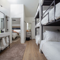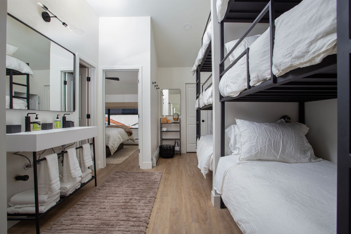 The oversized primary bedroom, custom closets, and immaculately appointed bathroom anchors the thoughtful luxury that exemplifies this perfectly designed ski condo. Primary is located on the main level, while the two rooms upstairs host their own queen bed. Between the two rooms are two bathrooms and a 6 person bunk bed in the common area for spreading out.