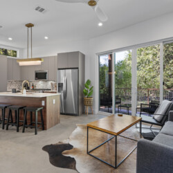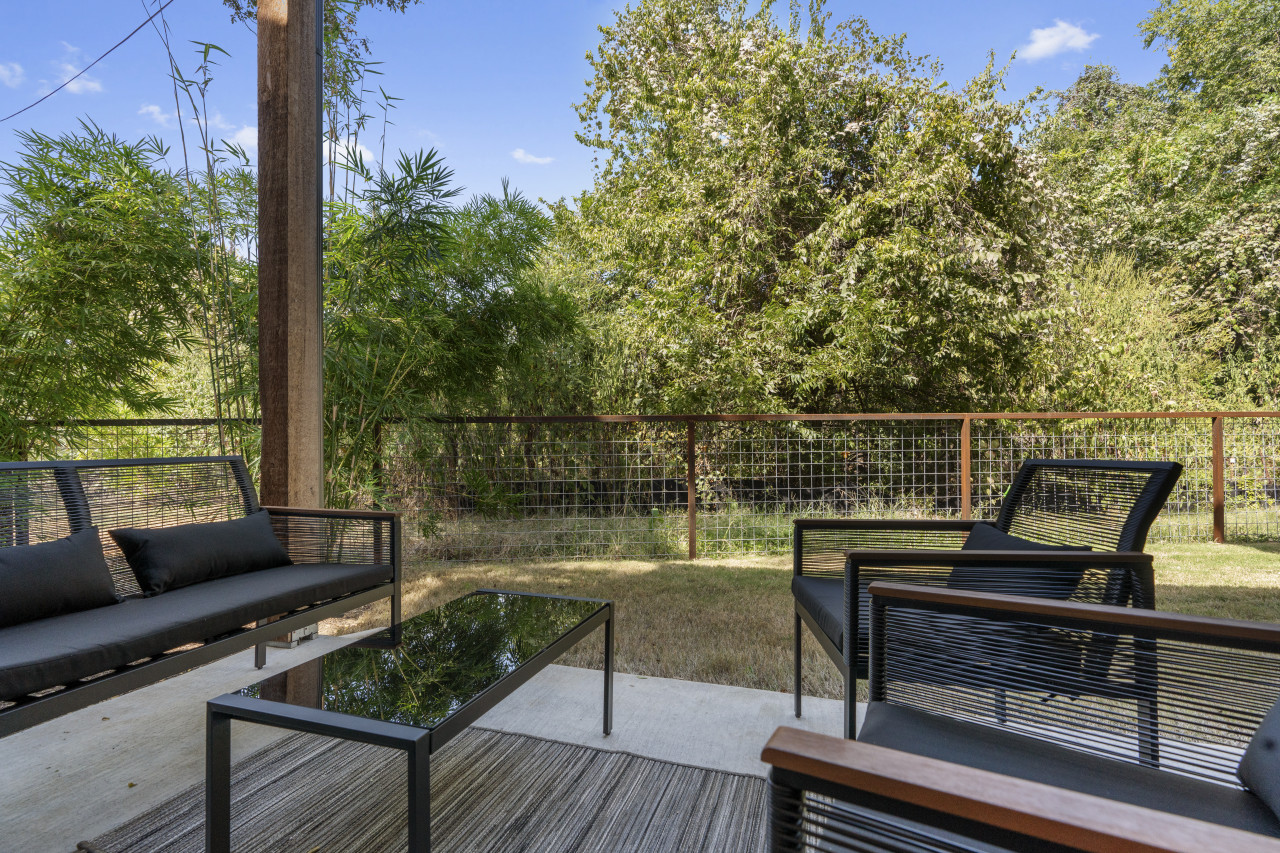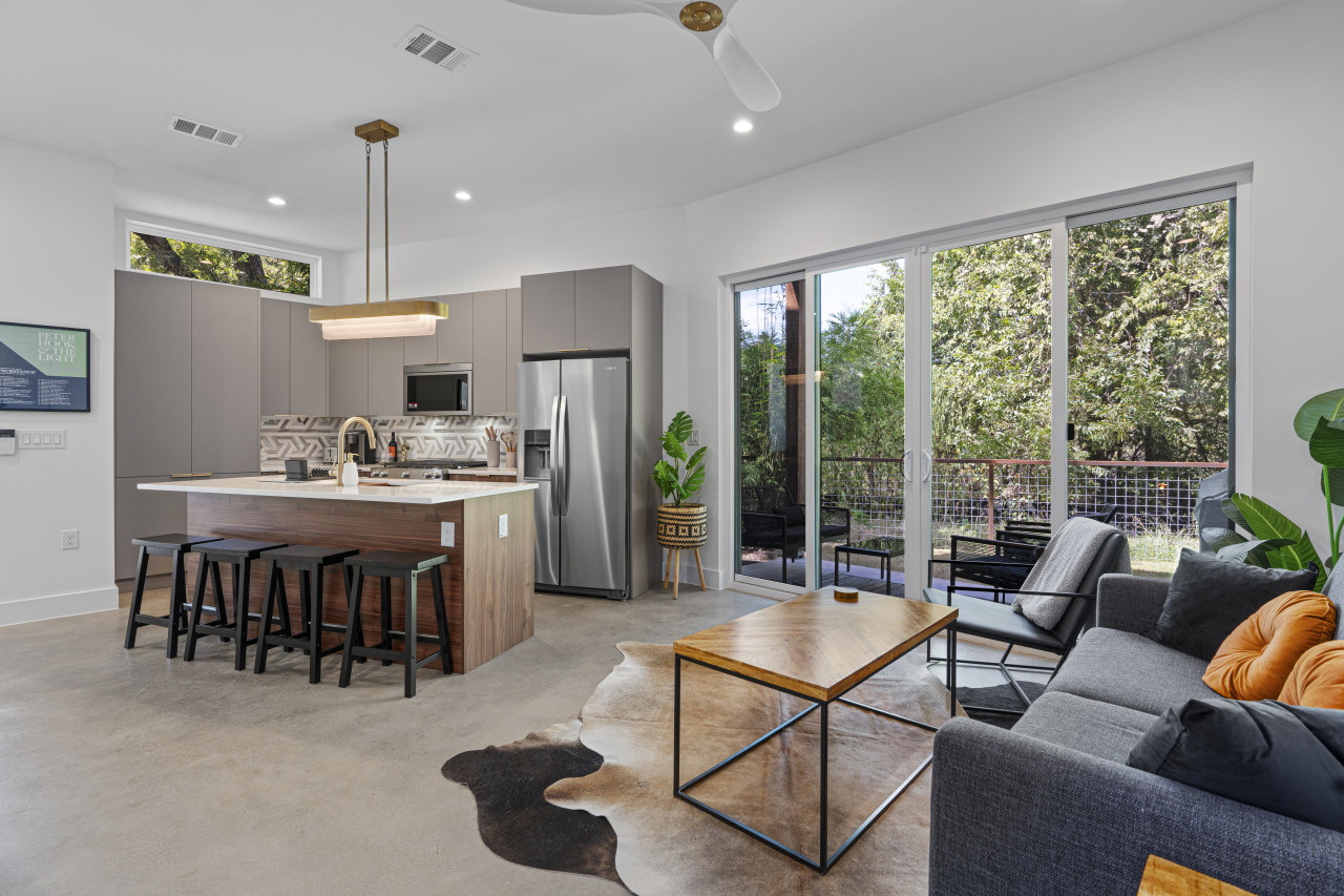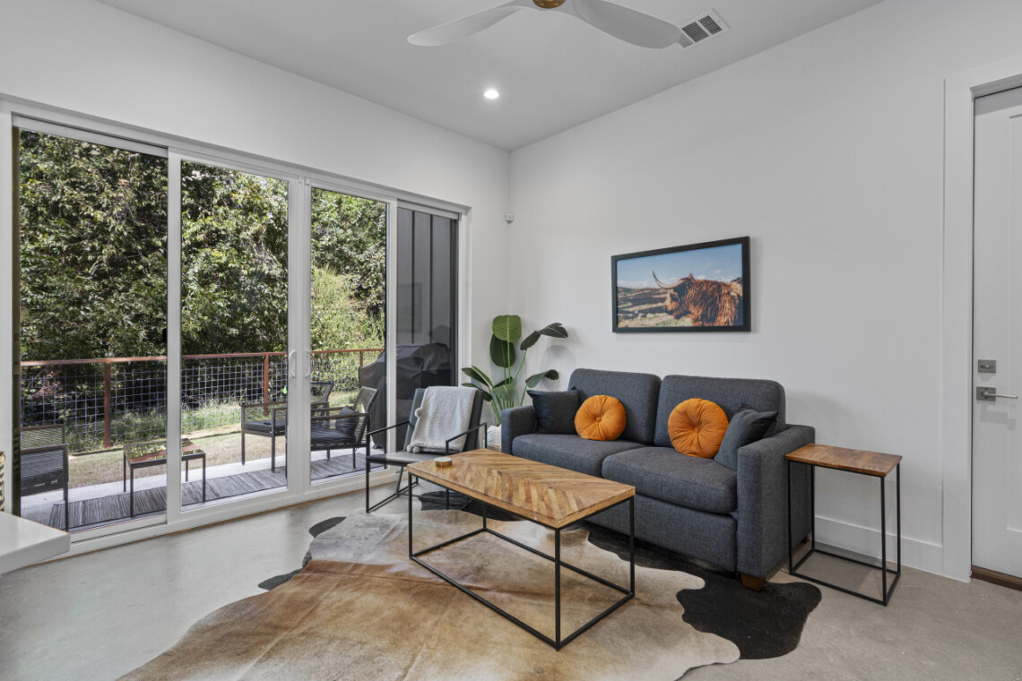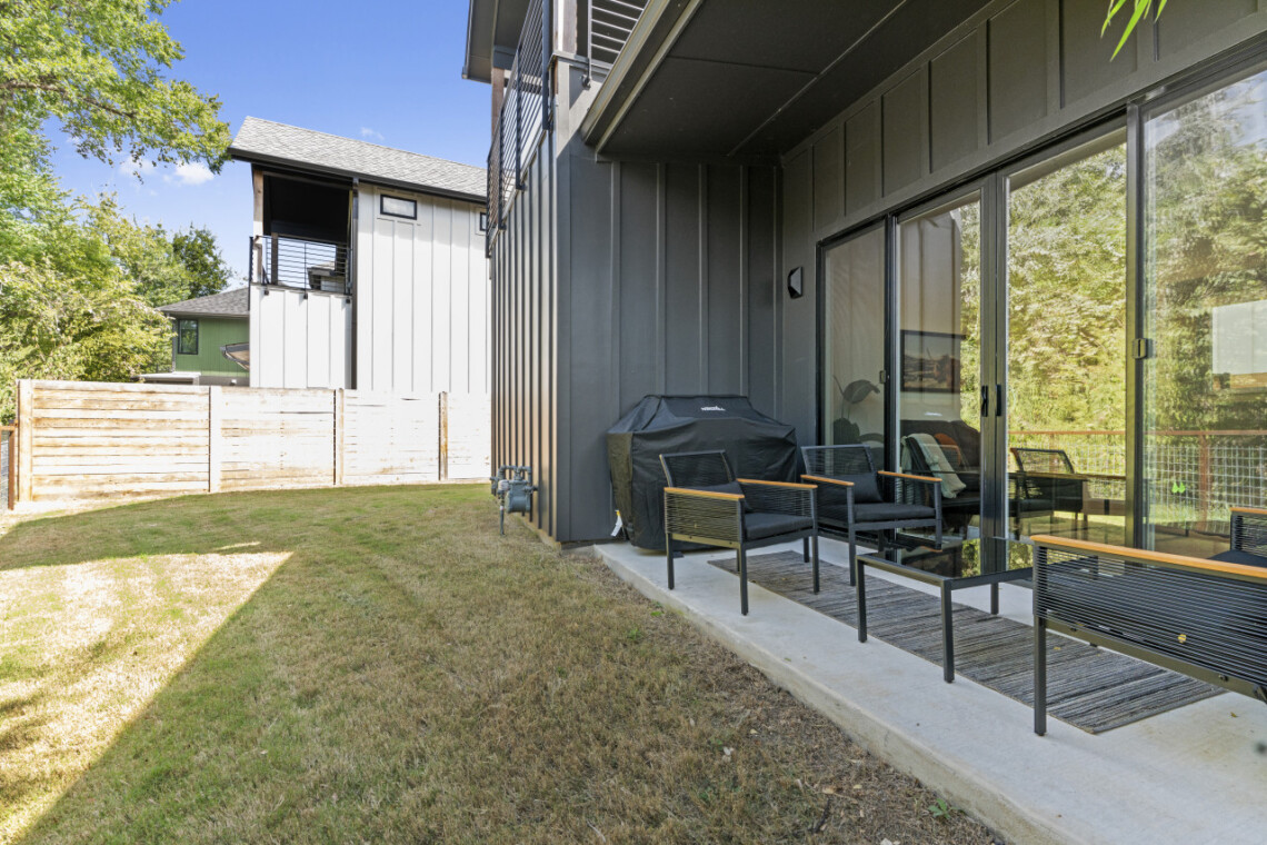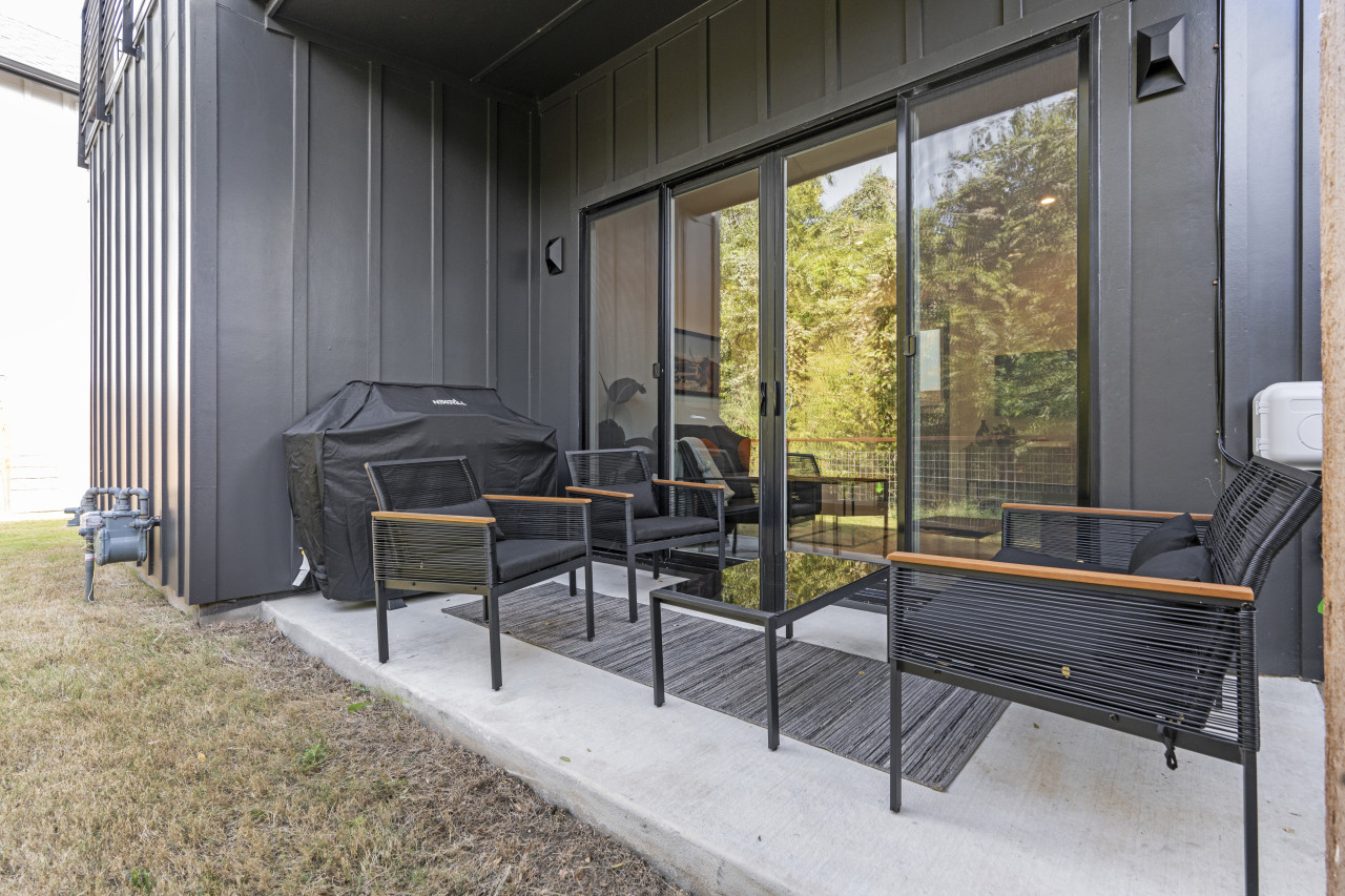 The open-concept living space is perfect for socializing, with a fully equipped kitchen that’s great for cooking and dining in. Large windows fill the home with natural light, creating a welcoming atmosphere for relaxing after a day of exploring Austin. Outside, a private patio offers a peaceful spot for morning coffee or evening drinks.