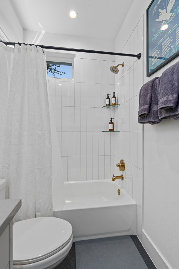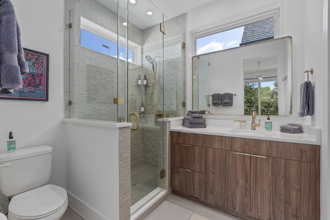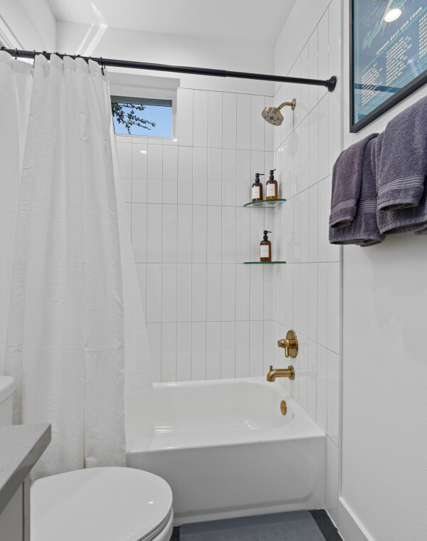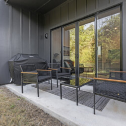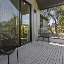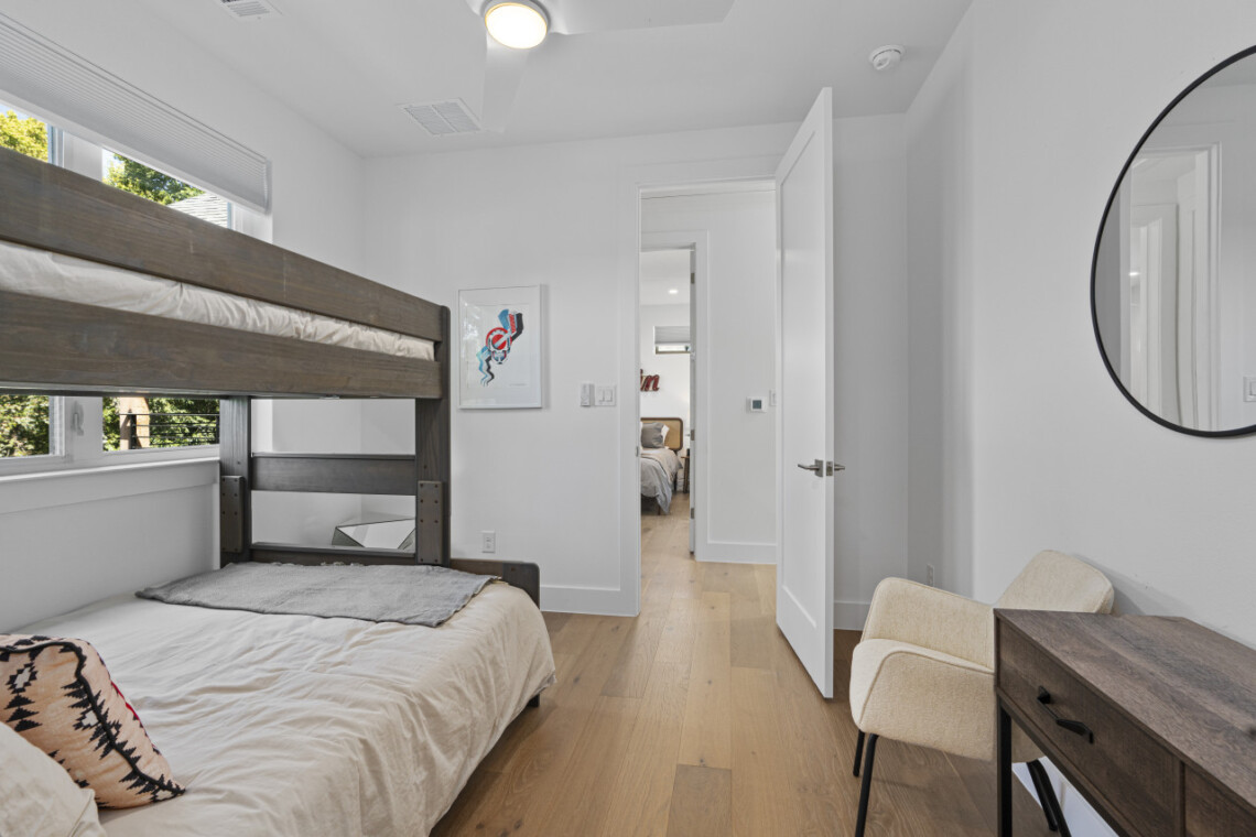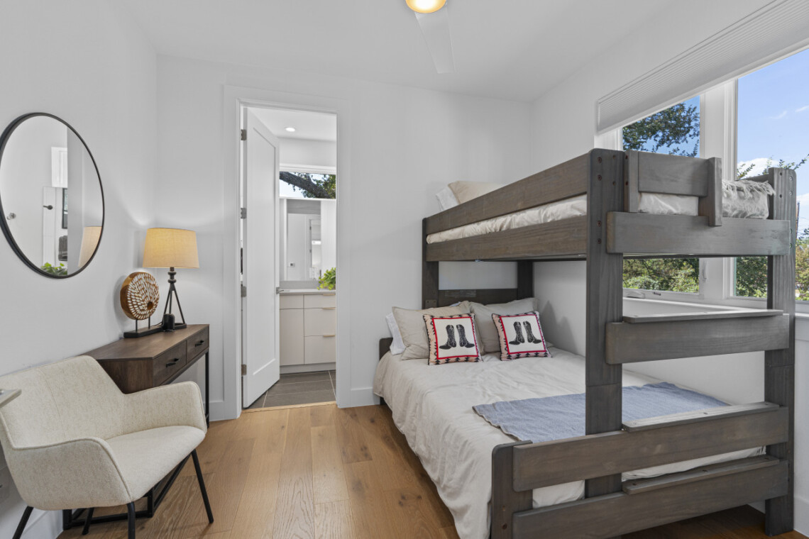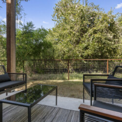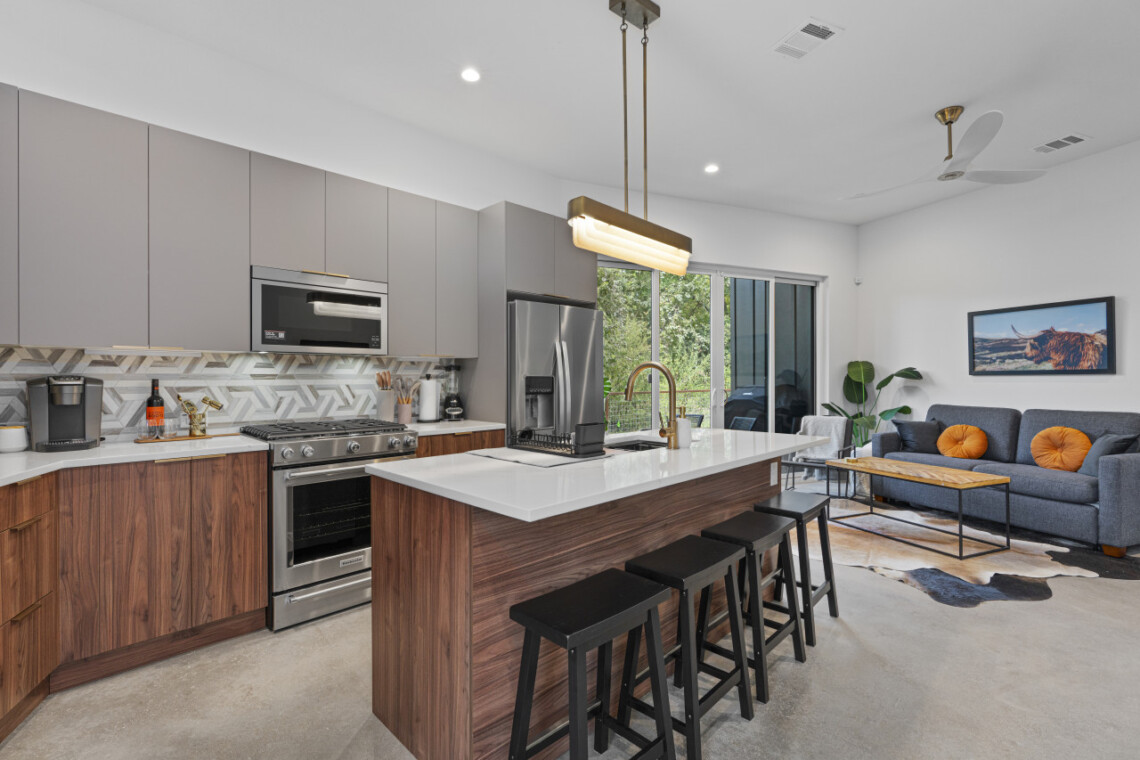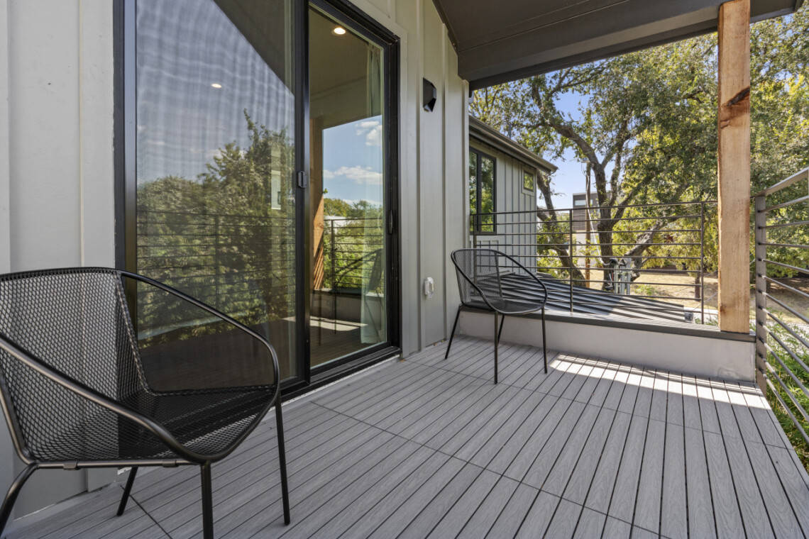 The open-concept living space is perfect for socializing, with a fully equipped kitchen that’s great for cooking and dining in. Large windows fill the home with natural light, creating a welcoming atmosphere for relaxing after a day of exploring Austin. Outside, a private patio offers a peaceful spot for morning coffee or evening drinks.
