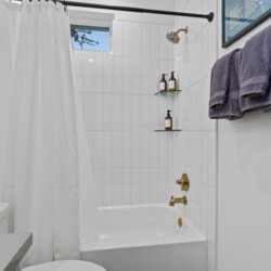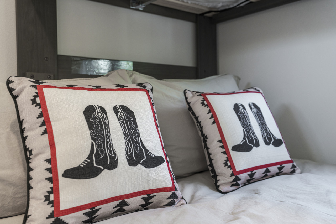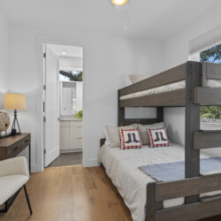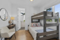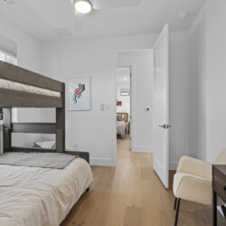 – 2 spacious bedrooms, each with en-suite bathrooms (1 king bed, 1 twin over full bunk bed)