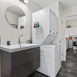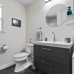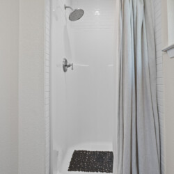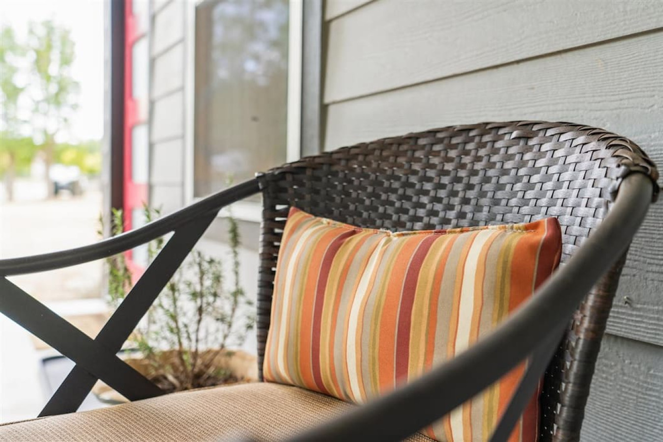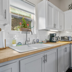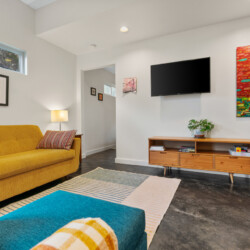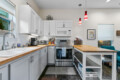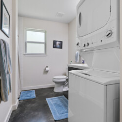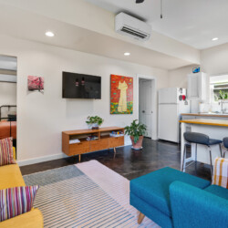 You’ll have access to the back half acre and is shared with lots of wildlife. There’s a large front yard with two hammocks and the porch includes a sitting area. Pets are welcome but need to be supervised and on a leash while outside because the fence isn’t secure around the entire property. There’s ample parking on site and the expansive driveway will accommodate several cars.