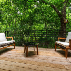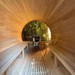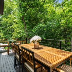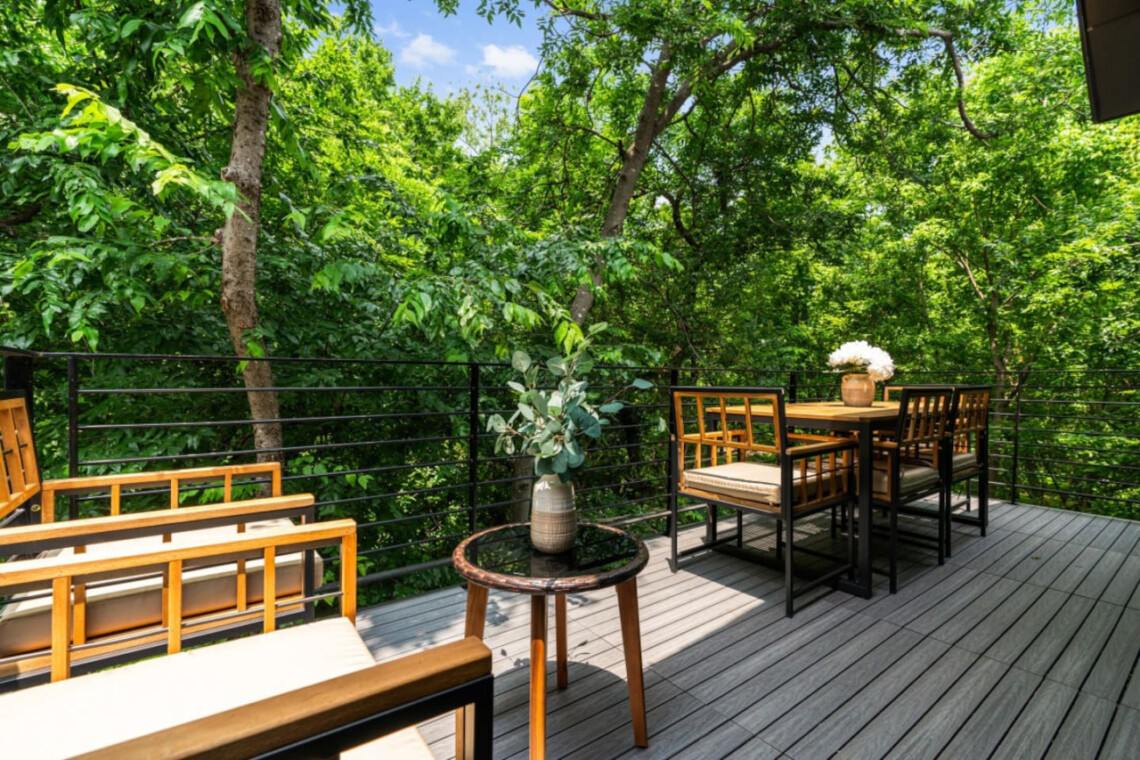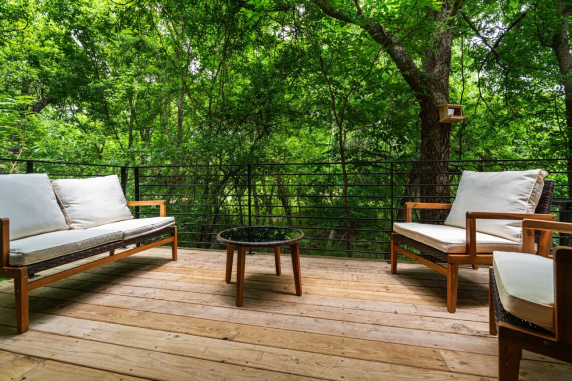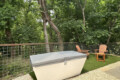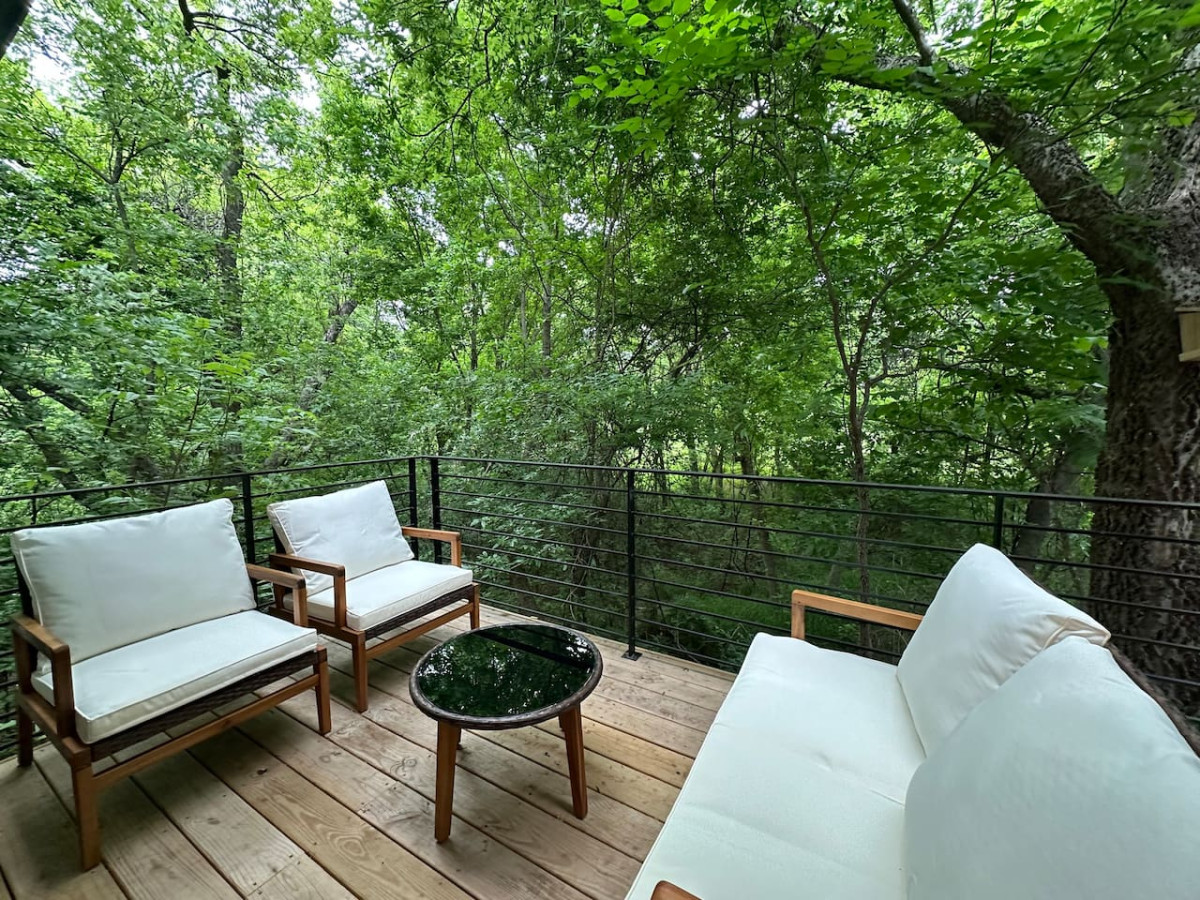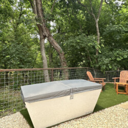 But the real highlight awaits outdoors – your private cold plunge pool beckons for refreshing dips under the Texas sun. Lounge on the side with a cold drink in hand as you soak up the tranquil views of the lush nature and the peaceful creek running just behind the property.